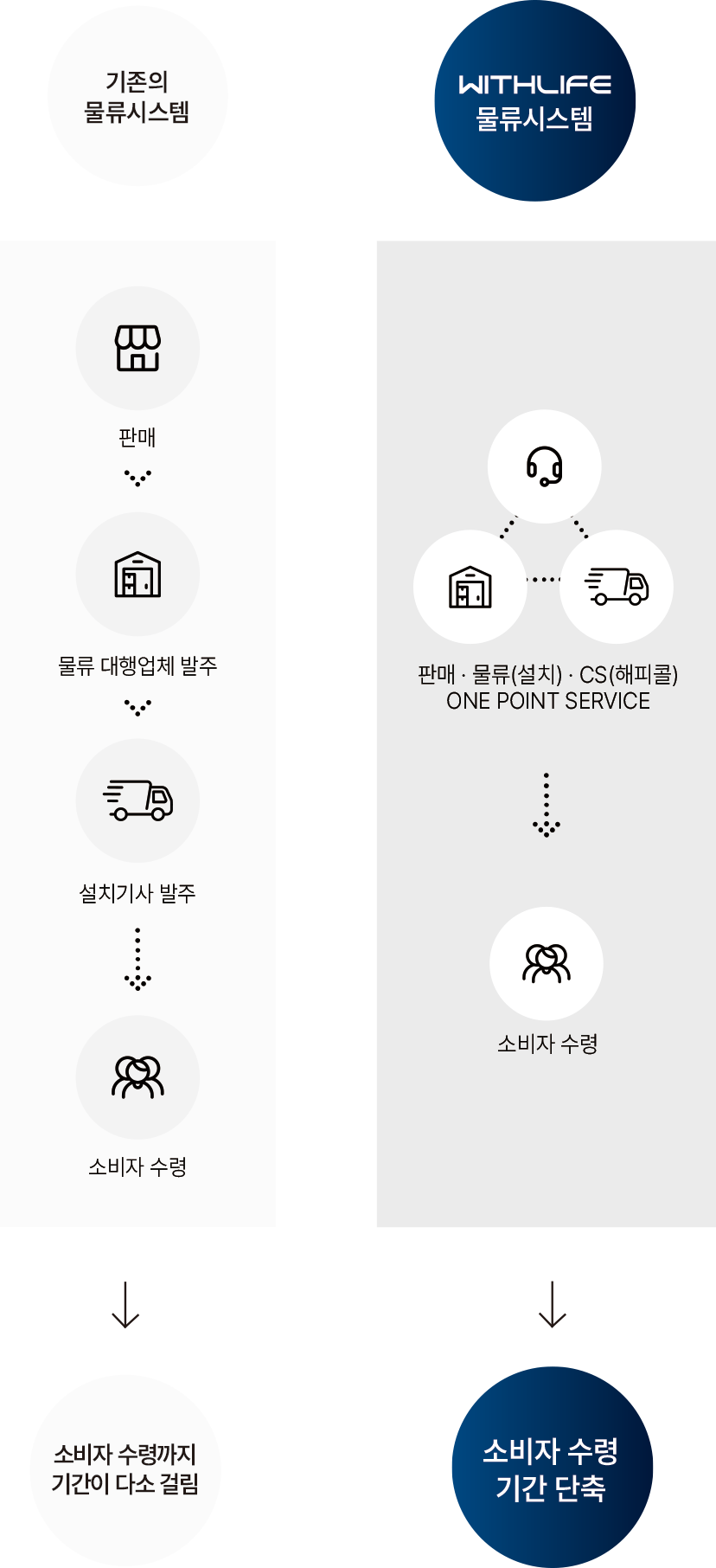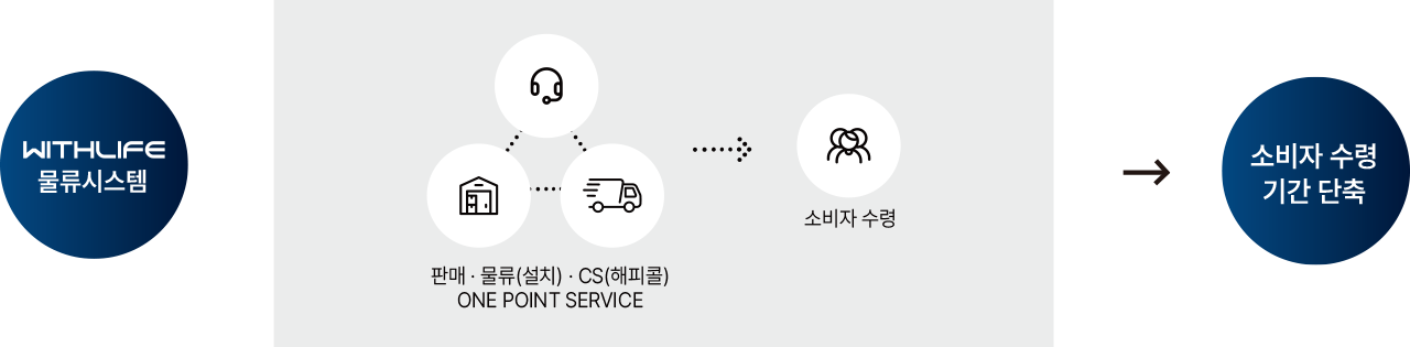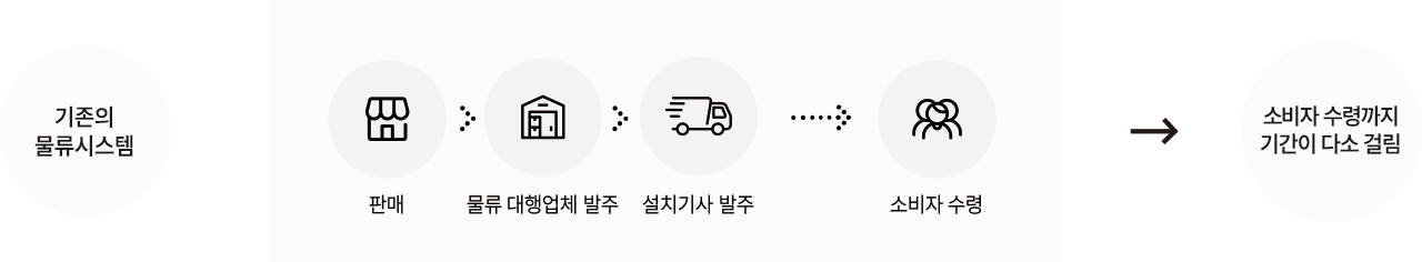 기존의 복잡한 발주과정을 통해 시간을 허비하는 구조가 아닌 발주· 설치(배송)· CS(해피콜) 등 물류 전반을 ONE POINT로 제공하여 발주부터 소비자 수령까지의 시간을 단축하는 자체 물류 서비스를 운영하고 있습니다. 여러 협력업체를 거치는 기존 방식과 달리 모든 과정을 자체 시스템으로 통합 관리하여 중간 단계의 불필요한 대기 시간을 제거하고, 이를 통해 고객은 주문 즉시 신속한 배송과 전문적인 설치 서비스를 받을 수 있으며, 설치 완료 후 해피콜까지 일관된 품질의 서비스를 경험할 수 있습니다.