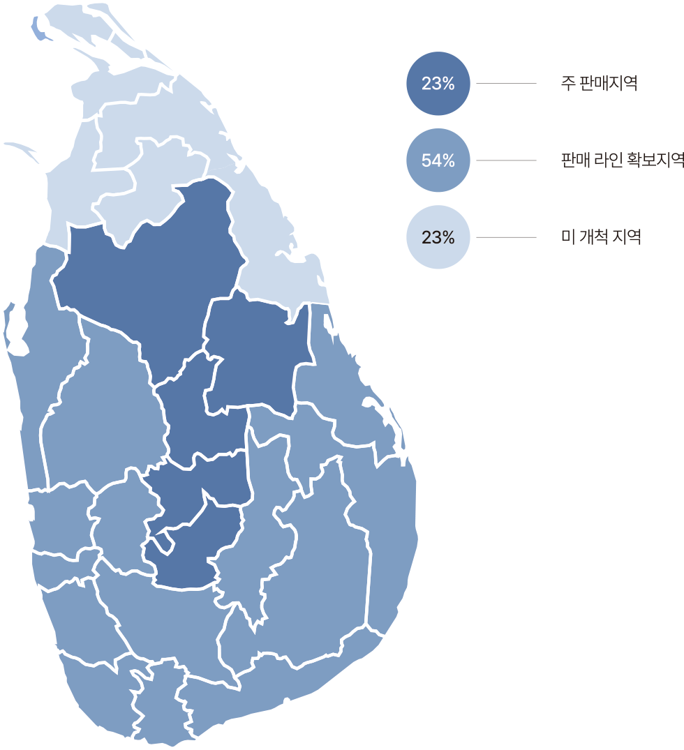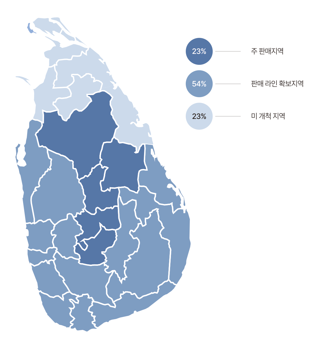 저희 위드라이프는 스리랑카 현지시장에서 전략적으로 주 판매지역, 판매라인 확보지역, 미개척지역 으로 권역을 분류하여 효율적인 영업망을 운영하고 있습니다.